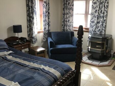 Embers is a wonderful apartment at Heather Hill Inn. The apartment has two very large rooms which includes a full kitchen, a refrigerator/freezer, microwave oven, toaster oven, coffee maker, and stove/oven. There is a dining area, sitting area, queen size bed and the featured item is the Harmon wood pellet stove. The second room also has a queen size bed, and a very large sitting area. High speed wi-fi internet and cable tv.